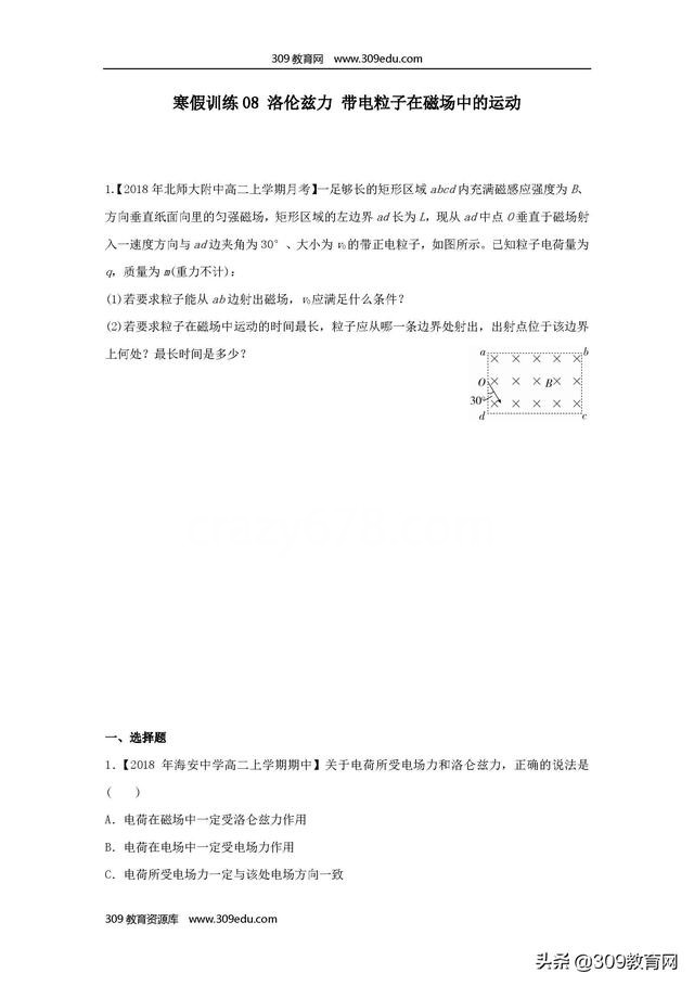 高二物理寒假训练08洛伦兹力带电粒子在磁场中的运动